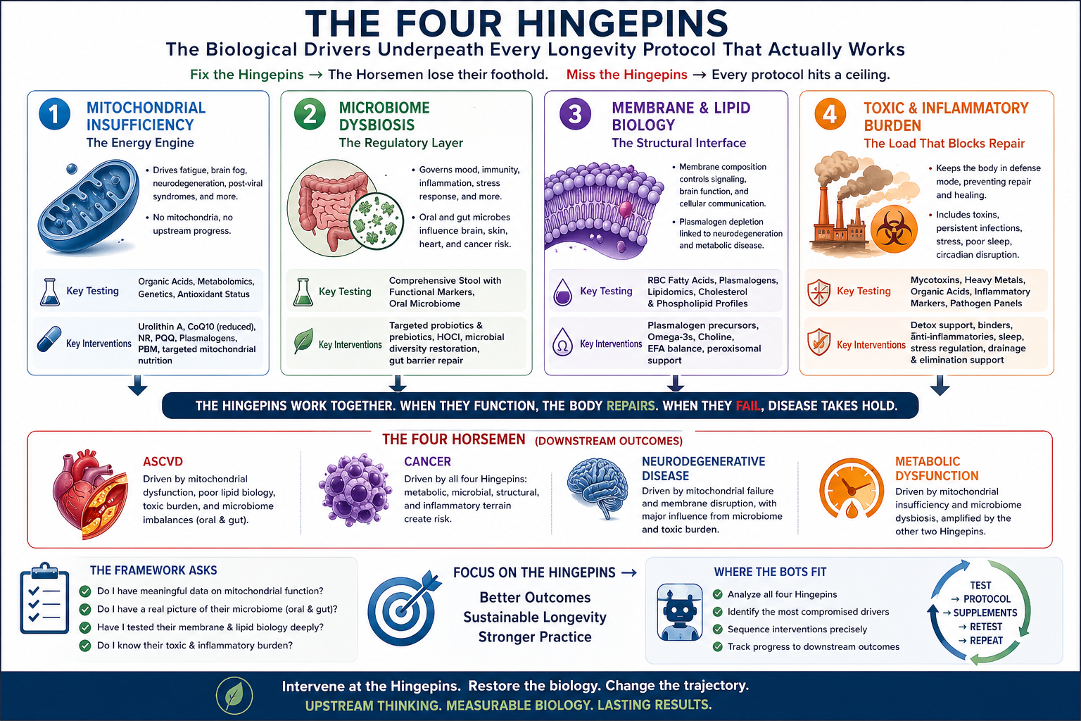 This is why a longevity protocol designed at the Horseman level alone hits ceilings. You can manage ASCVD markers impressively with statins, diet, and exercise — and still fail to reverse the underlying biology because the mitochondrial, membrane, and inflammatory Hingepins were never addressed. You can produce good-looking cancer prevention checklists and still miss the patient whose microbiome is the actual driver. You can prescribe the correct cognitive longevity protocol and watch it stall because the membrane biology never got the attention it needed.